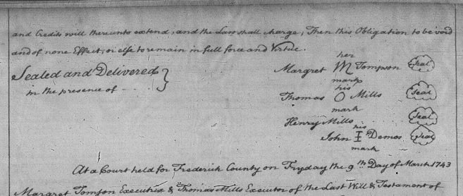 Not everyone made an “X” as their mark when acknowledging a document and not literally signing their name. That’s what three of the individuals who signed a 1743 bond in Frederick County, Virginia, did. Margaret Thompson appeared to have made an “M,” Thomas Mills appeared to have made an “O,” and John Demos appeared to have made some form of an “I.” Of course the marks as shown in this image are not their actual marks. They are the clerk’s attempt to reproduce their marks when transcribing the document so slight liberties may have been taken.