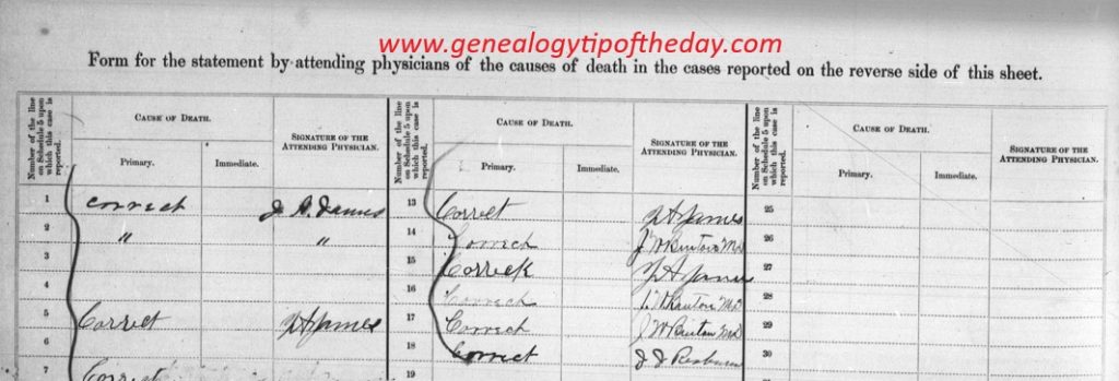 Did you know that in the 1880 US mortality census that the doctor of the deceased was supposed to confirm or correct the cause of death for everyone listed on the census? That form was on the back of the actual mortality schedule page. Just make certain to go to the next image to see it when viewing in online as most sites have put the back of the page on the next image.