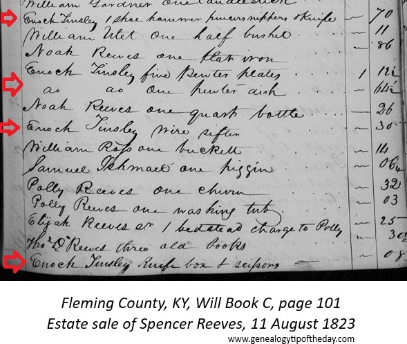 In August of 1823, Enoch Tinsley purchased several items at the estate sale of Spencer Reeves in Fleming County, Kentucky. While it’s interesting to see what Enoch purchased and it offers some insight into his day-to-day life, there are a few other genealogy clues it gives us: