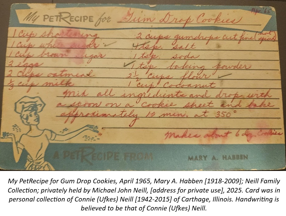 My PetRecipe for Gum Drop Cookie, April 1965, Mary A. Habben [1918-2009]; Neill Family Collection; privately held by Michael John Neill, [address for private use], 2025. Card was in personal collection of Connie (Ufkes) Neill [1942-2015] of Carthage, Illinois. Handwriting is believed to be that of Connie (Ufkes) Neill.