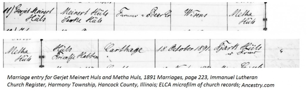 That’s what could done when transcribing this marriage record between a husband and wife with the same last name. Many descendants use the last name Huls, but if I’m trascribing this marriage the way it is written, then it needs to be “”Metha Hüls married Gerjet Meinert Hüls at the Immanuel Lutheran Church.” If I do not have the ability to use an ulmaut on my keyboard, then I could go with “Metha Huels married Gerjet Meinert Huels at the Immanuel Lutheran Church.”