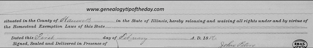 This is part of a record copy of an 1886 deed from Hancock County, Illinois–this is not the original deed, but the courthouse’s official copy of it.