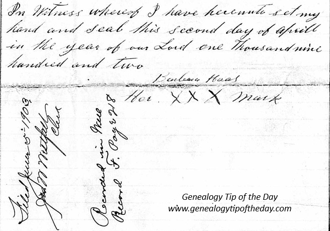 Some may be tempted to assume that Barbara was illiterate based on this signing of her will. That’s not the correct conclusion to draw from this piece of information. It simply means that she made her mark on her will in 1902. She could have been told to “make her mark” and was complying with that request. She perhaps was only physically able to write an “x” instead of her actual name. Barbara’s actual signature appears numerous times in various local records in Hancock County, Illinois, where she lived beween 1850 and her death in 1903. She could definitely write her own name and her 1860 census enumeration indicated she was able to read and write–although that was most likely in German.