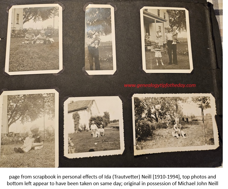 But the positioning of photos can contain clues and is information that should be preserved (scanning or digital camera/phone photos are fine). The photo on the upper right I knew contained my grandmother (holding baby) and her in-laws. From other pictures and based on his face, I was certain the boy standing up was my Dad’s older brother. I’m also reasonably certain the child my great-grandfather is holding is his second grandson my Dad’s first cousin.