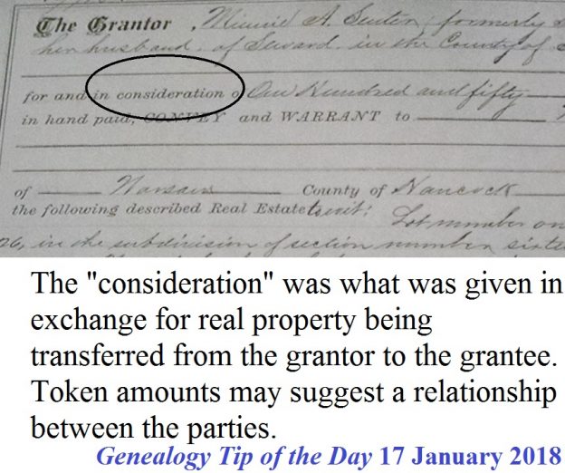 When using land records, always note the consideration listed on the document in addition to the real property being transferred. The “consideration” was what was given in exchange for real property. Token amounts ($1, a few shillings, or some similar value) may suggest a relationship between the parties. “Love and affection” or some phrasing indicating a personal connection between the seller and the buyer may also be stated. Small consideration amounts compared to other deeds for similar properties may also suggest a connection between the parties involved.