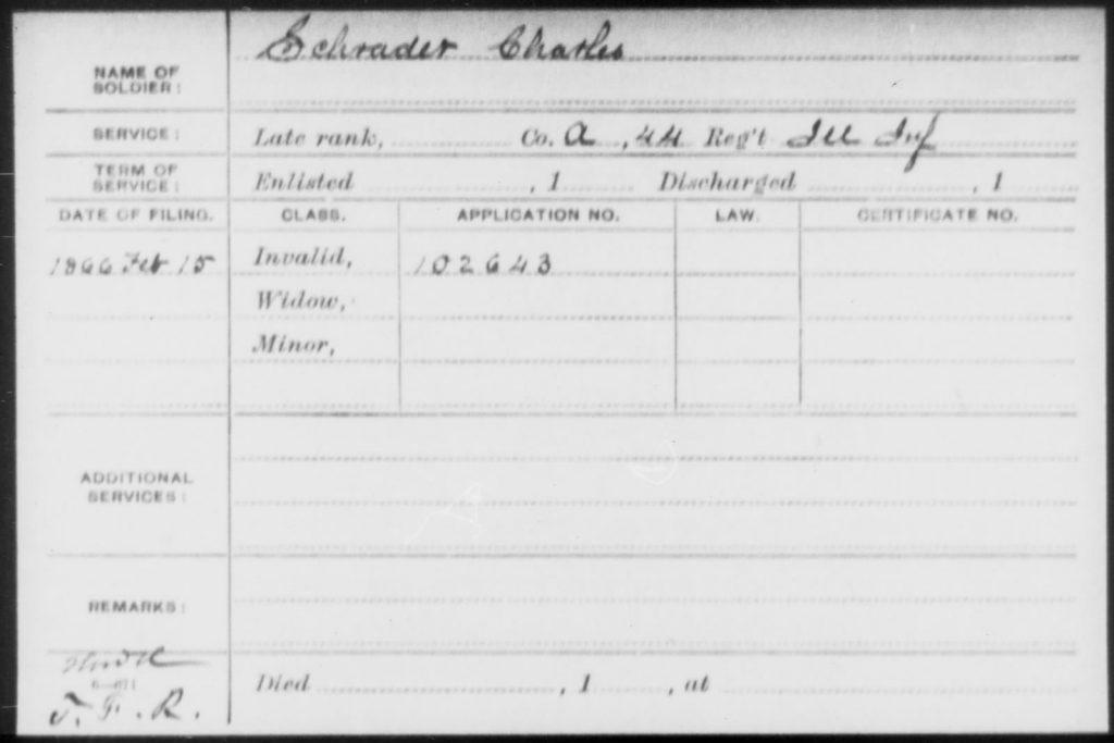 The pension index card for Illinois Civil War veteran Charles Schrader indicated an application number but no certificate number. This usually means that the application was denied. This is what happened in Schrader’s case–he received no pension.